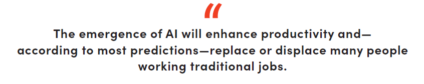 The emergence of artificial intelligence (AI) will enhance productivity and—according to most predictions—replace or displace many people working traditional jobs. The questions are many, and the number of traditional jobs should be expected to decrease when making comparisons to historical metrics. A conversation about the new opportunities and possibilities may be the more important conversation.