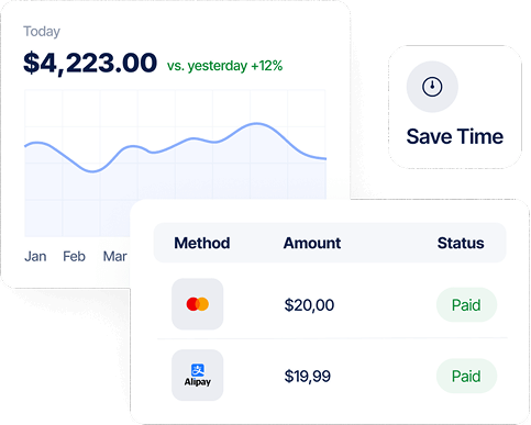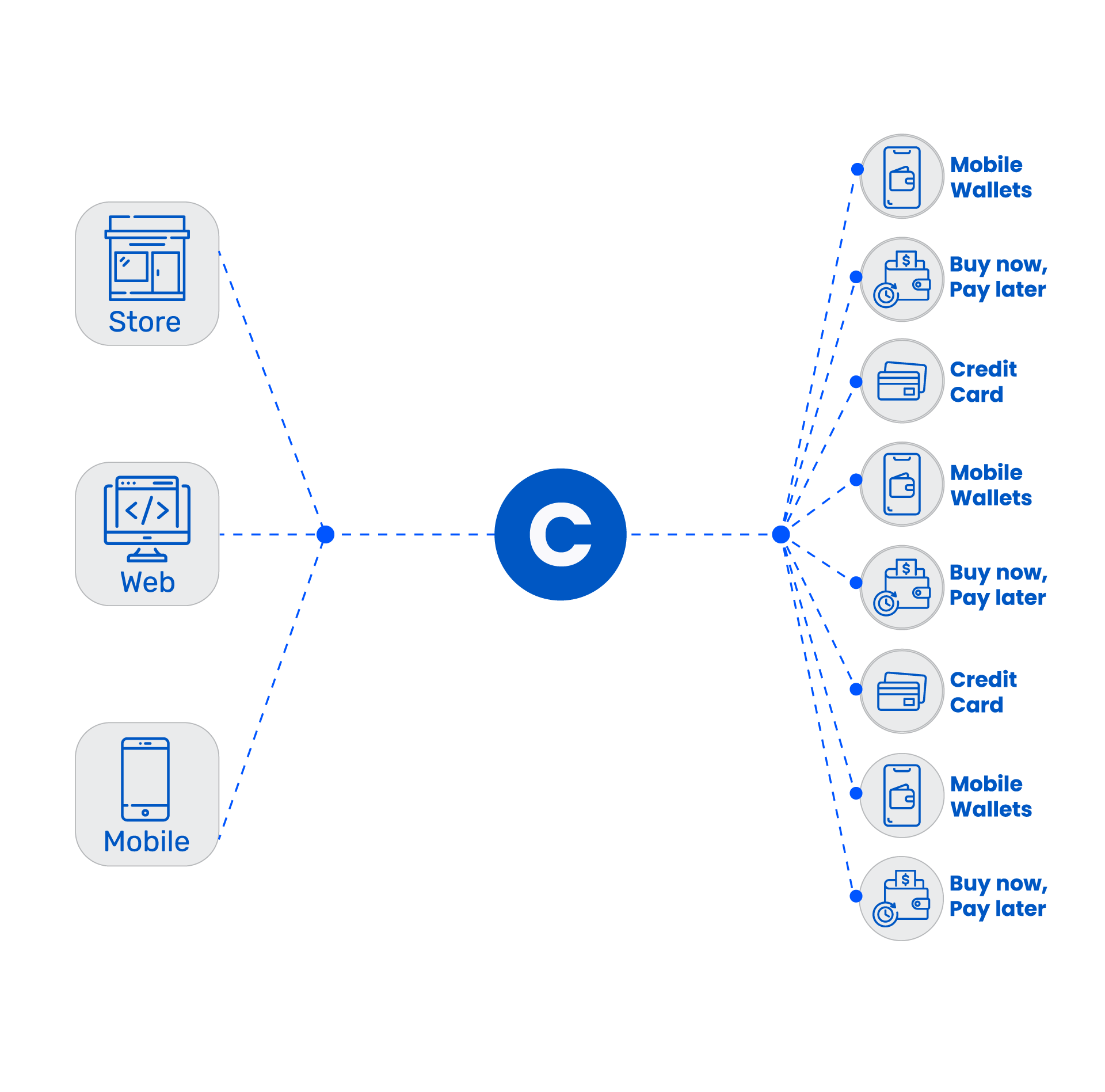 Seamlessly integrate multiple payment methods including global/local digital wallets, BNPL, and cards. Reach customers online, in-app, and in-store with highly smooth payment experience.